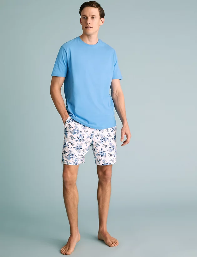Relax and get ready for a comfy night's sleep in these breathable pure cotton pyjamas. Regular-fit set comprises a short-sleeved, round-neck t-shirt and floral hibiscus-print shorts. Finished with a button fly and a secure drawstring