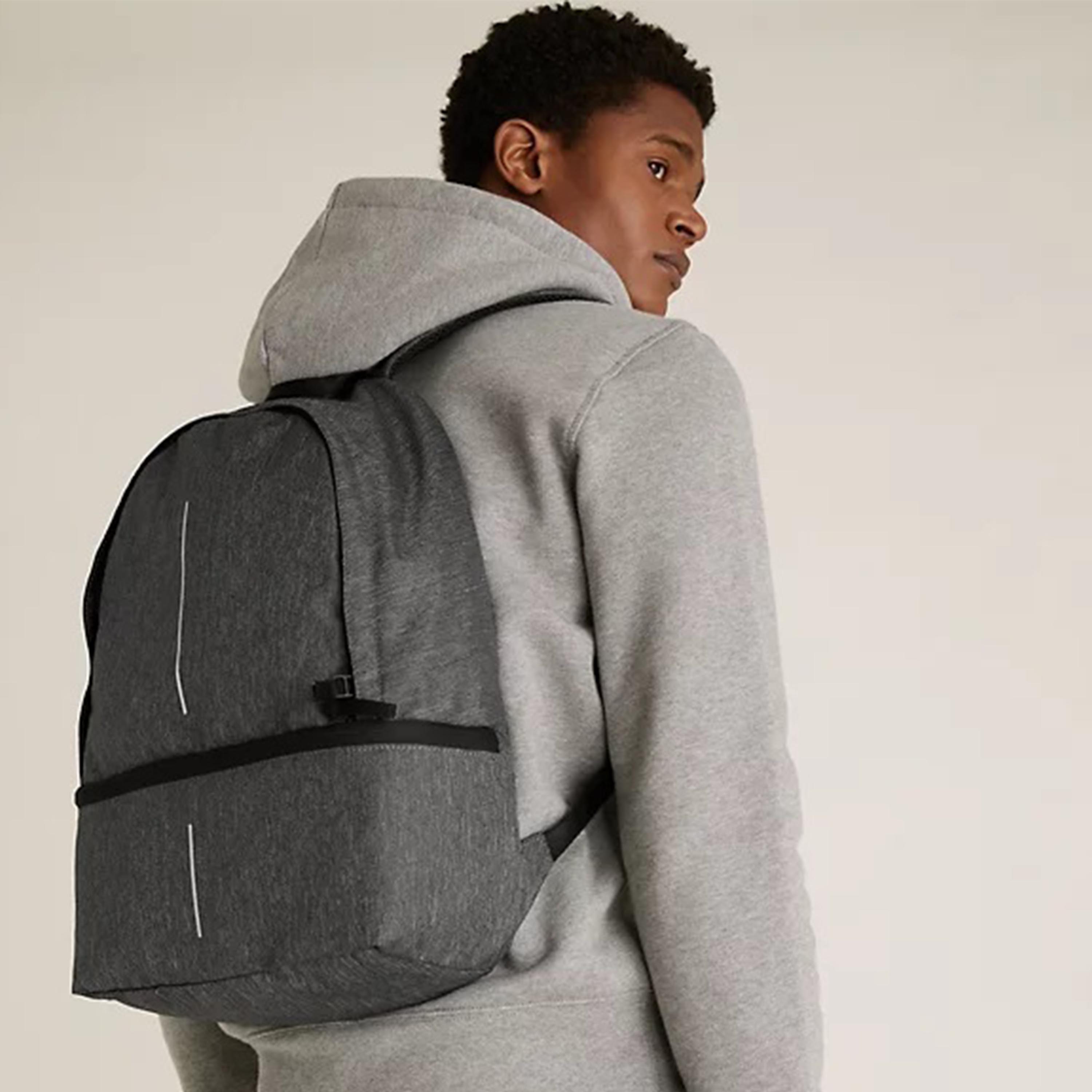 The simple design and flecked fabric of this sports backpack gives it a smart, stylish edge. Fully lined, with a zip fastening and a separate compartment for trainers. Reflective strip for nighttime use. Wipe-clean material for easy care.