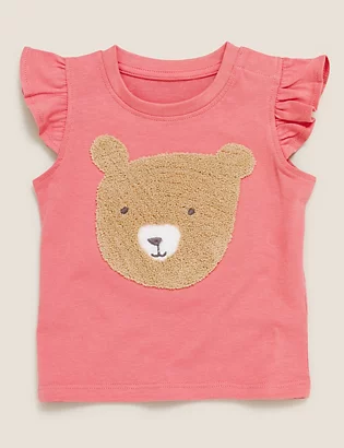 The textured bouclé bear adds a fun touch to this pure cotton jersey t-shirt. Short sleeves with a popper fastening at the shoulder for easy dressing. Shoulder frills create a pretty look.