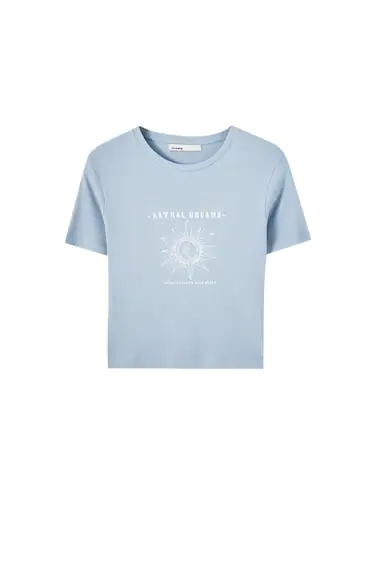 Cropped T-shirt featuring a printed graphic on the front, a round neckline and short sleeves. Made of 100% cotton.